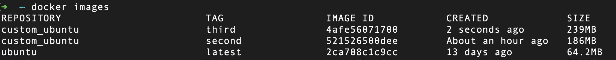 저는 위에서 언급한 변경사항을 두번으로 나눠서 적용하면서 커밋을 두번해서 두번째 TAG를 second로 두었습니다. 어쨋든 원래의 도커 이미지였던 ubuntu와 IMAGE ID도, SIZE도 다른 새로운 이미지가 생성되었음을 확인할 수 있을겁니다.